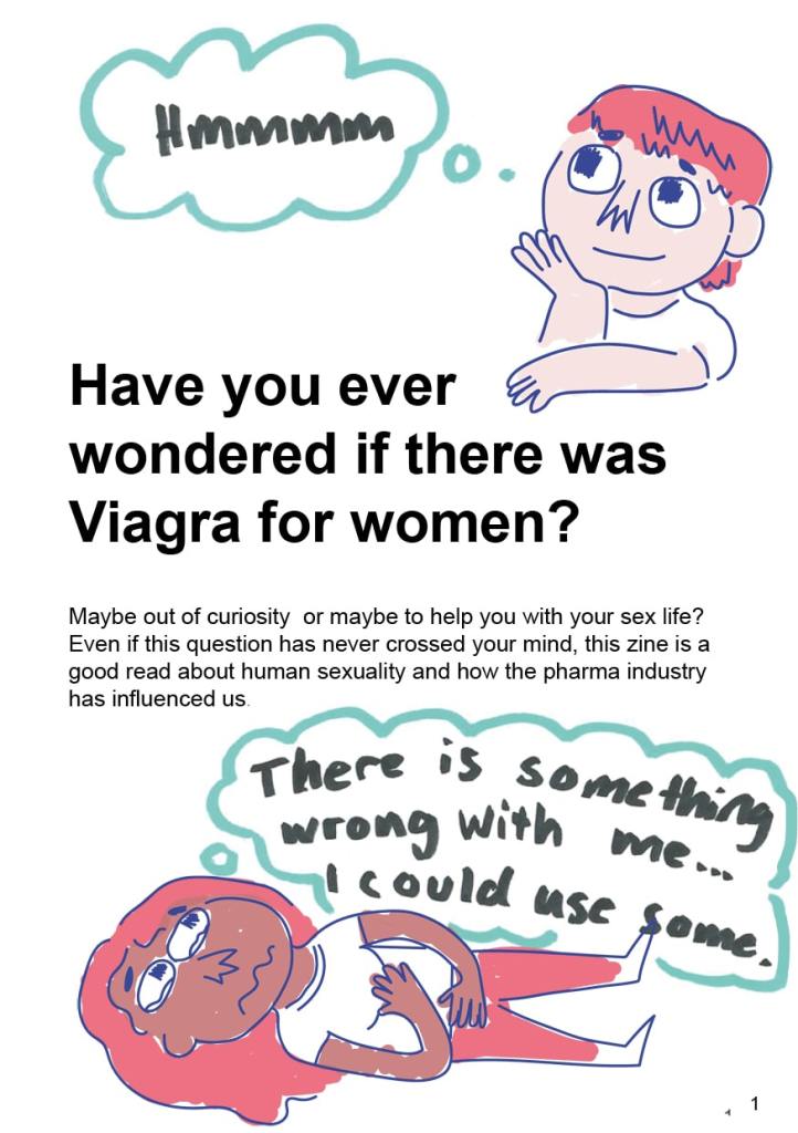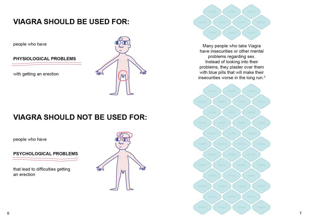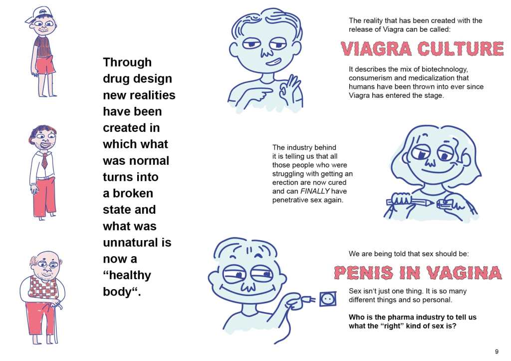 In this zine, I looked at what Viagra is meant to do versus how it’s actually used, and how the pharmaceutical industry is trying to apply the same idea to sell a “Viagra for women.” This connects to ideas of heteronormativity and the expectations placed on different genders, as well as how companies profit from people’s insecurities. I also explored how medications get approved and how narratives are created to market them.